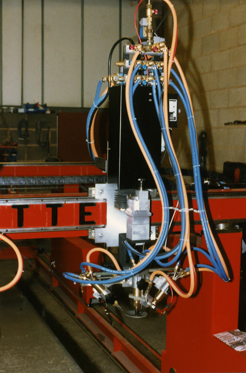 Advanced Cutting Systems manual indexing, Triple torch lightweight flame planing head complete with machine torches, gas control valves, mechanical height sensing device, and all necessary hoses for rectilinear plate edge preperation.